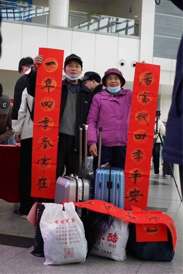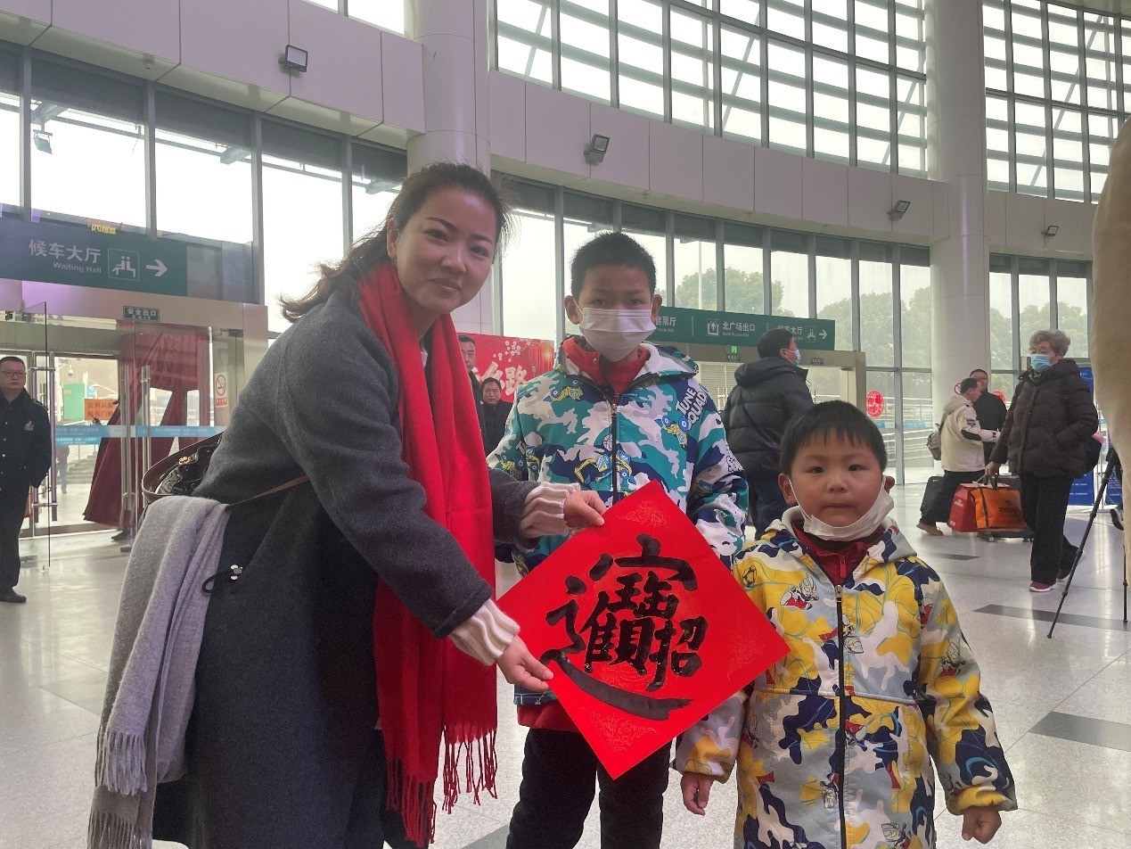 “千门万户曈曈日,总把新桃换旧符”,活动现场,红纸墨香,欢声笑语,整个车站洋溢着浓浓的年味。玄武区红山新城人大代表吴维军、潘毓洁、傅兆水、沈英、李敏、黄必桥、吴小燕等与书法爱好者们将现场挥就墨迹未干的春联、福字等送给车站内的返乡旅客们。旅客们接过这些带着温度的祝福,脸上洋溢着幸福的笑容。有的旅客迫不及待地将春联拍照,准备分享给远方的亲人;有的则小心翼翼地将“福” 字收好,期待着回家张贴。志愿者们穿梭在人群中,维护秩序,协助活动开展,成为现场一道亮丽的风景线。
