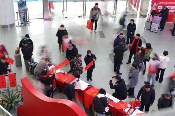 中国经济网南京1月24日讯(记者 符仲明)1月23日上午,南京长途客运站(小红山客运站)内热闹非凡,南京市玄武区红山新城人大代表们与一众书法爱好者们正在这里现场蘸墨挥毫,为旅客们送上饱含新春祝福的春联与 “福” 字,这份祝福温暖了每位在场返乡旅客的心。