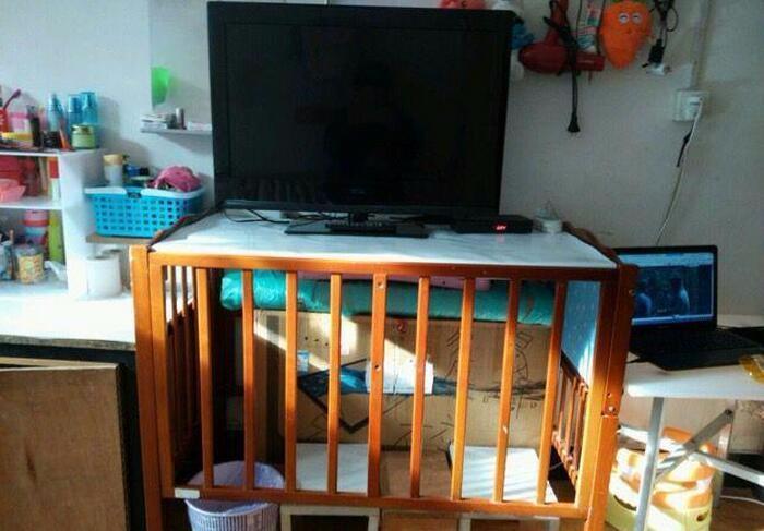 看看我的电脑桌,其实是婴儿床改造而来的。孩子大了用不上了,居然又被我利用起来了,厉害吧?哈哈!