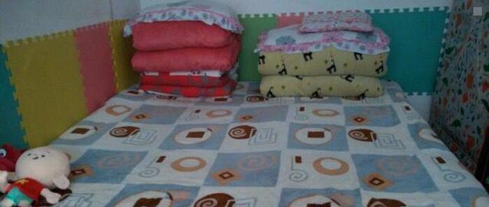 床其实也不大,不过现在孩子还小,也能将就一下。我在床四周的墙上铺了垫子,这样床铺就不容易脏了。